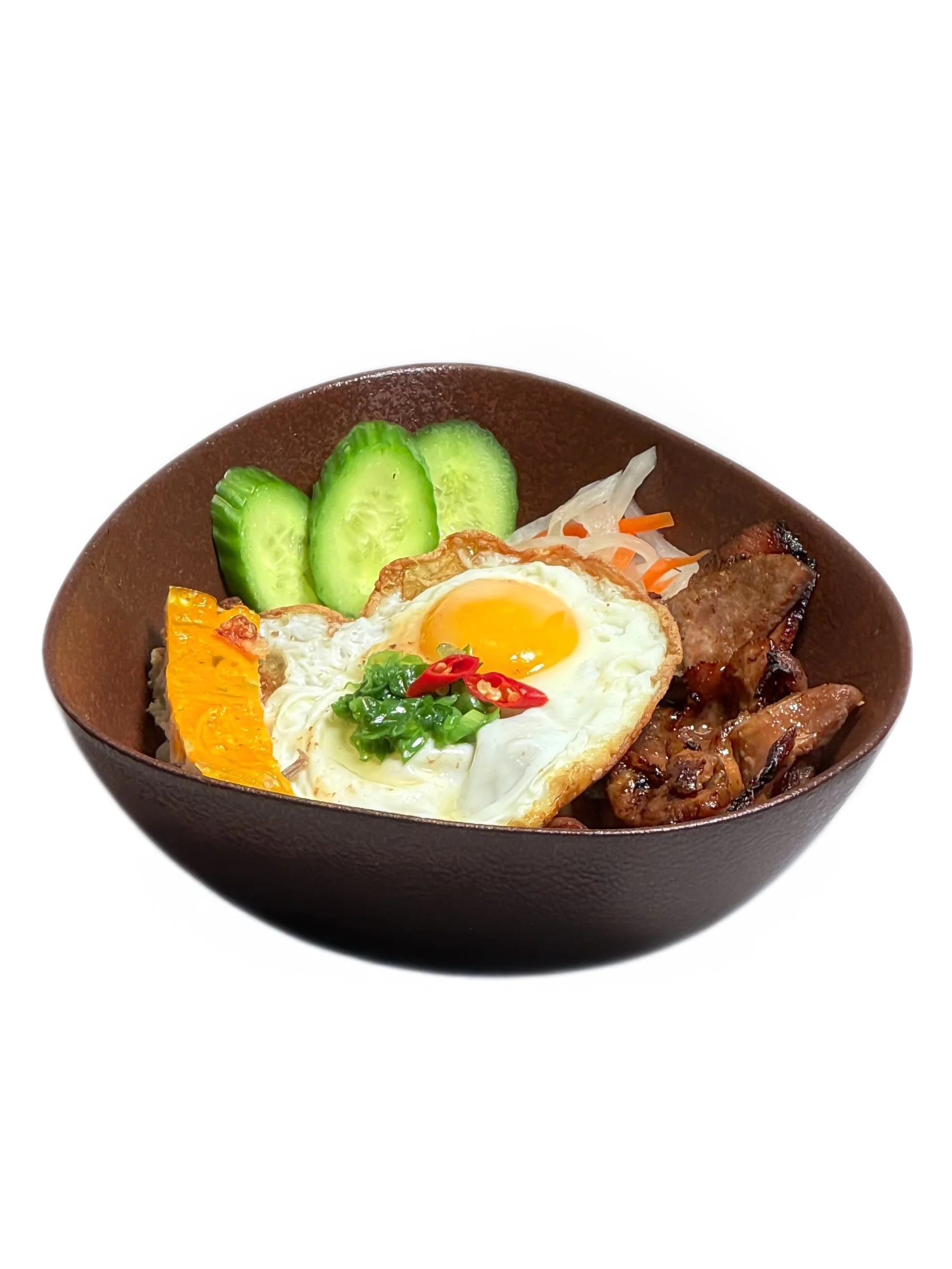(a) room Uống Ăn CƠM TẤM Soft broken rice with grilled pork, scallion oil, steamed egg meatloaf, and a sunny-side-up egg, served with our sweet-sour homemade fish sauce. $22 Broken Rice with Grilled Pork